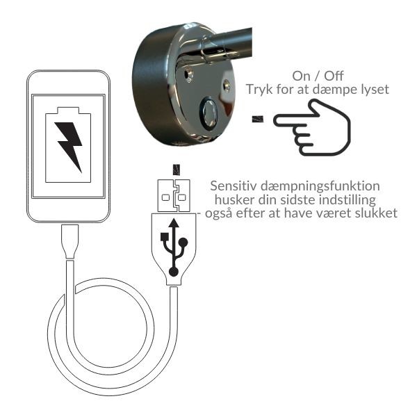 Med inbyggt känsligt dimmersystem och USB-laddare.