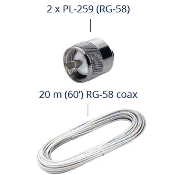 Produkten levereras med monteringsfästen i rostfritt stål och SO-239-kontakt för enkel och stabil installation. Med den medföljande 20 meter långa kabeln kan antennen monteras på masttoppen på de flesta segelbåtar utan behov av ytterligare förlängningar.